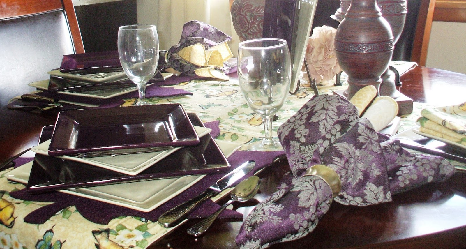 The purple candlesticks, and jars I got years ago at Hobby Lobby (clearance aisle of course), the napkins and table runners are from Tuesday Morning and the cream dishes are from Pier One.